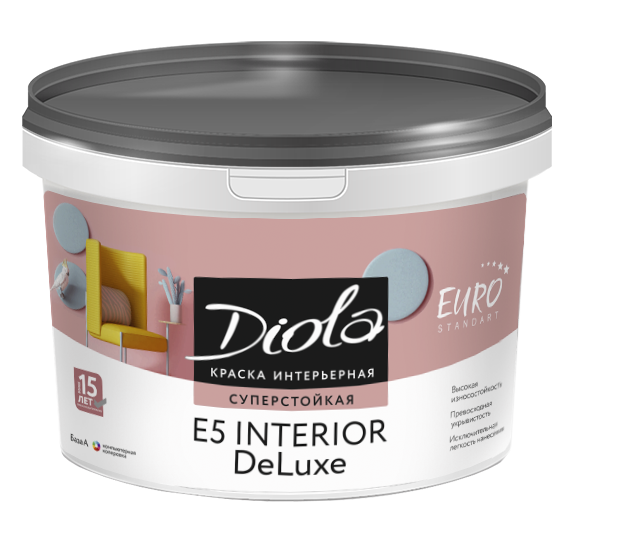 Краска Е5 INTERIOR DeLuxe соответствует европейским стандартам DIN. Превосходная стойкость к мытью и мокрому истиранию надежно и надолго сохранит красоту окрашенной поверхности. Благодаря легкому нанесению краска позволяет получить первоклассный результат без особых усилий.